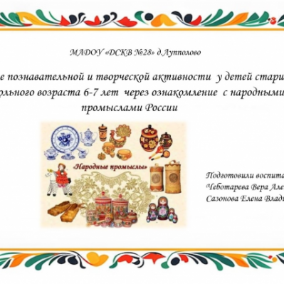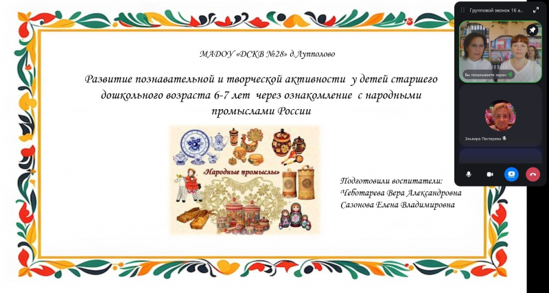- Сазонова Елена Владимировна и Чеботарева Вера Александровна в своем выступлении рассказали коллегам о развитии познавательной и творческой активности, самостоятельности детей через ознакомление с народными промыслами России.