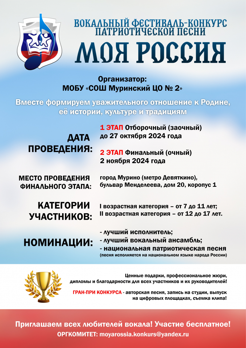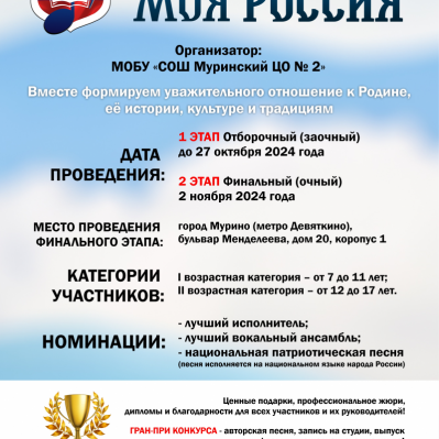 Муринский центр образования №2 приглашает обучающихся Всеволожского района принять участие в Первом вокальном фестиваль-конкурсе патриотической песни «Моя Россия».