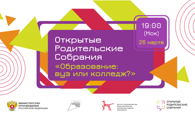 Второе Всероссийское открытое родительское онлайн-собрание состоится 26 марта 2021 года в 19:00 по московскому времени и будет посвящено теме, актуальной для старшеклассников и их родителей – «Образование: колледж или университет?»