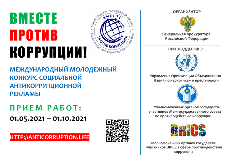 Организатором Международного молодежного конкурса социальной антикоррупционной рекламы «Вместе против коррупции!» (далее – конкурс) является Генеральная прокуратура Российской Федерации.  Участниками конкурса могут быть граждане любого государства (авторы-физические лица или творческие коллективы) в возрасте от 14 до 35 лет. Номинации: «Лучший плакат» и «Лучший видеоролик» тема: «Вместе против коррупции!».