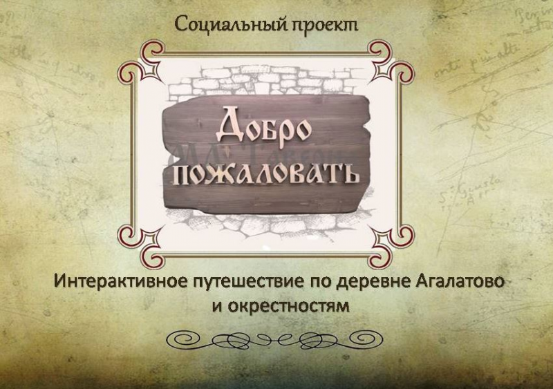 Целью проекта «Добро пожаловать» является организация интерактивного путешествия по деревне Агалатово и окрестностям. Проект способен решить выявленную участниками исследования проблематику отсутствия систематизированного и доступного по форме банка информации о достопримечательностях.