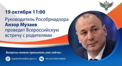 Всероссийская встреча с родителями руководителя Федеральной службы по надзору в сфере образования и науки Анзора Музаева пройдет 19 октября 2020 года в 11:00 мск.
