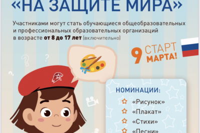До 8 апреля 2022 года принимаются заявки на участие во Всероссийском творческом конкурсе «На защите мира». Организаторами конкурса выступает Всероссийское детско-юношеское военно-патриотическое общественное движение «ЮНАРМИЯ» при поддержке Министерства просвещения Российской Федерации.